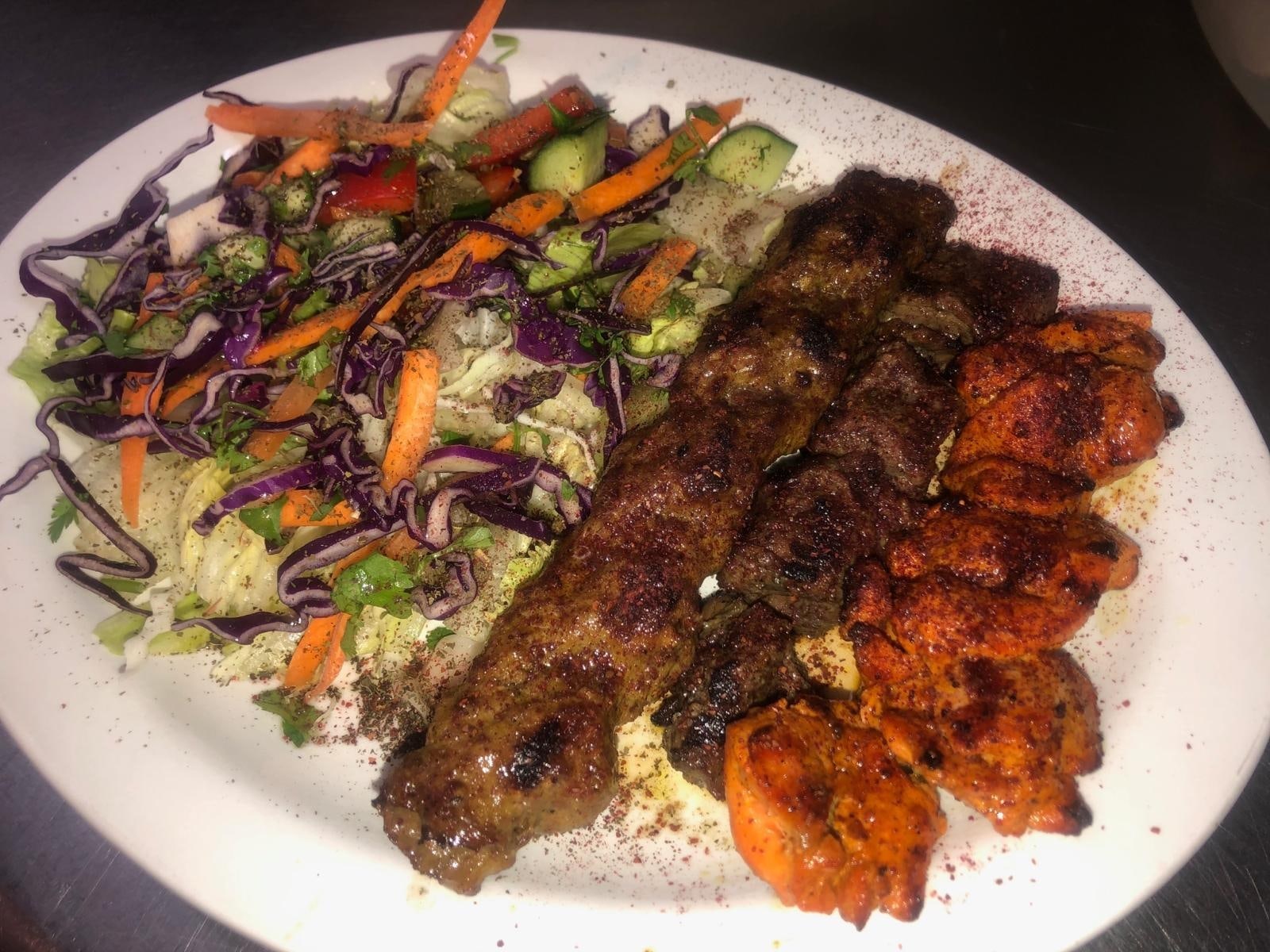 A mix of 3 different Kebabs. One Skewer of Chicken Kebab, Shami Kebab and Tekka Kebab.
